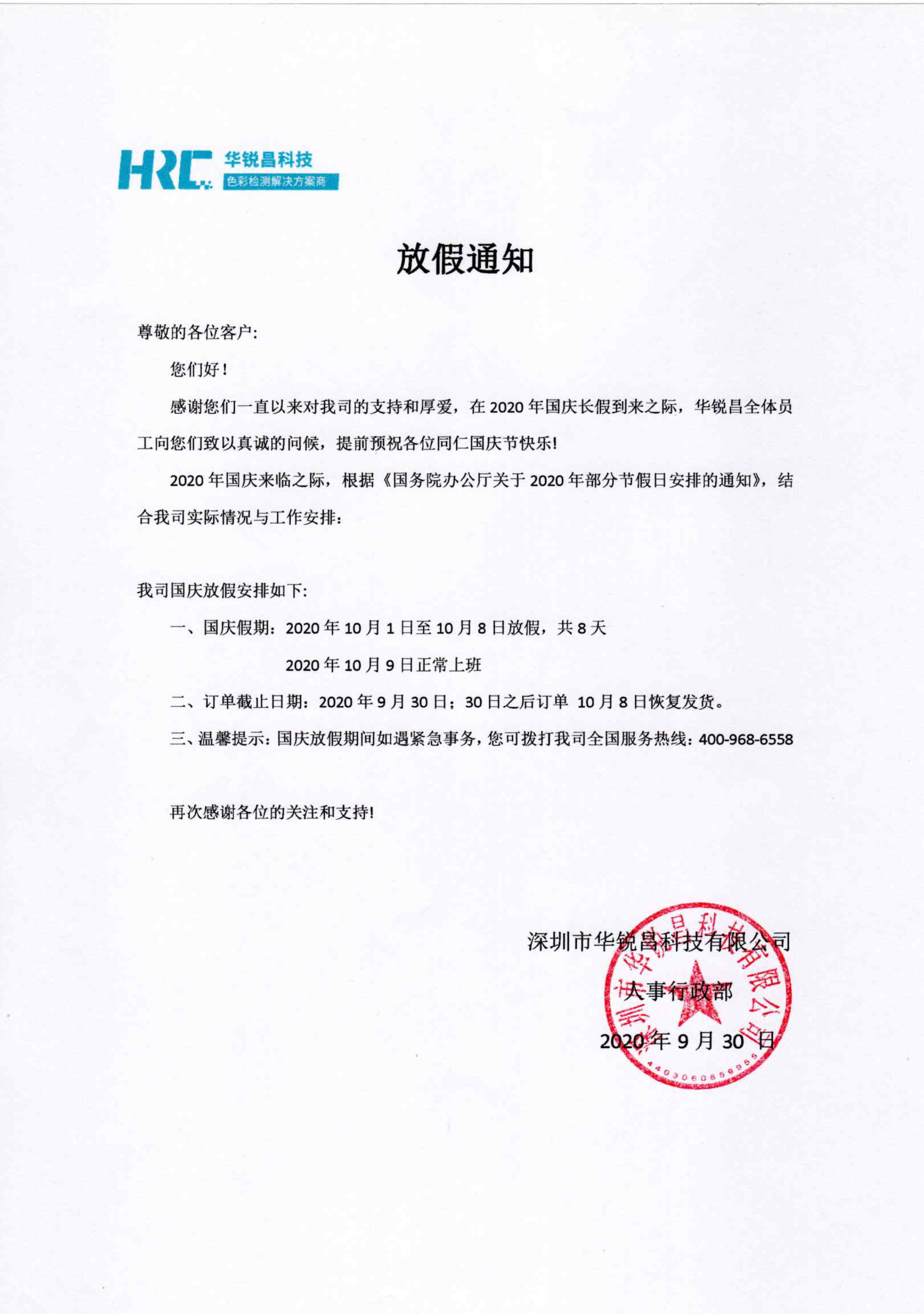 三、溫馨提示:國(guó)慶放假期間如遇緊急事務(wù),您可撥打我司全國(guó)服務(wù)熱線:400-968-6558