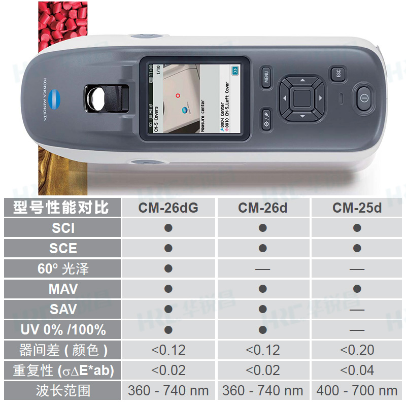 柯尼卡美能達的新一代CM-26dG系列,包含三款便攜式分光測色計型號,高端旗艦型號CM-26dG和CM-26d擁有精湛的技術(shù)和業(yè)界快速的測量精度,其中,CM-26dG是二合一機型,可同時進行色彩與光澤測量,CM-26d專注于色彩測量,CM-25d則是該系列的經(jīng)濟高效型號,高性價比之選。