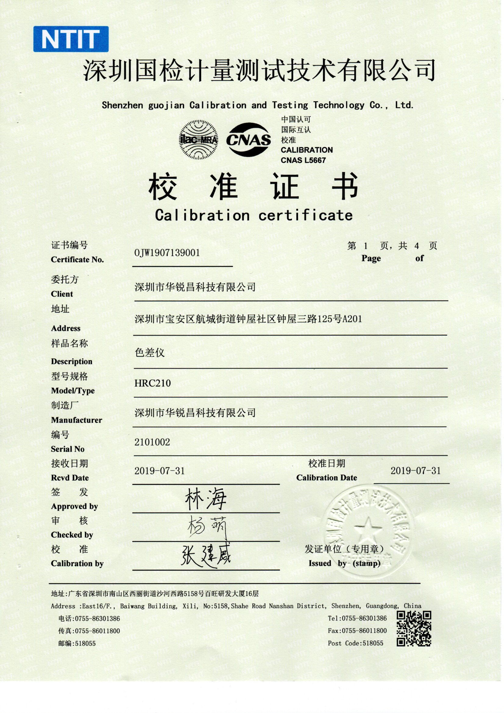 HRC華銳昌色差儀國家計(jì)量測試中心校準(zhǔn)證書
